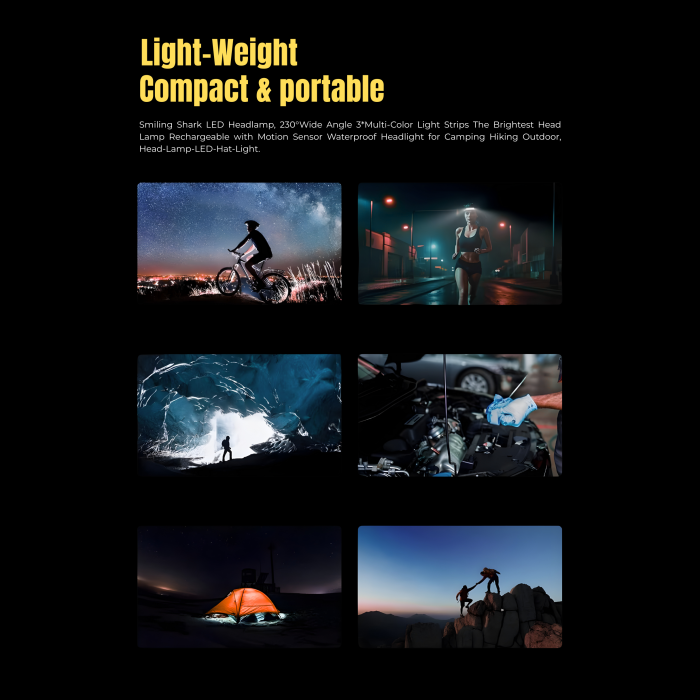 Light up your adventures with the Smiling Shark Rechargeable LED Headlamp — the ultimate gear for travelers, campers, hikers, and outdoor explorers. Compact, powerful, and waterproof, it delivers unmatched brightness and convenience wherever you go.